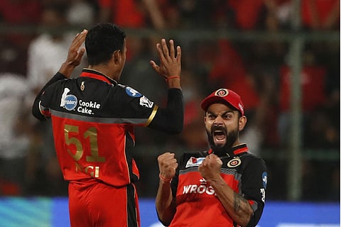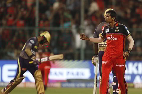 RCB's Navdeep Saini, right, celebrates the dismissal of KKR captain Dinesh Karthik, left. (AP Photo/Aijaz Rahi)