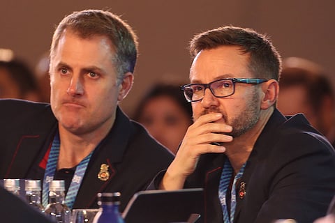 Simon Katich (left) and Mike Hesson at the IPL auction in Kolkata in December 2019. BCCI pix