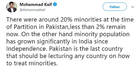 "There were around 20% minorities at the time of Partition in Pakistan, less than 2% remain now. On the other hand, minority population has grown significantly in India since Independence. Pakistan is the last country that should be lecturing any country on how to treat minorities," Mohammad Kaif tweeted.