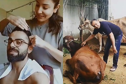 Wife Anushka gives Virat a haircut; Sehwag lends a hand in tending to his cows.