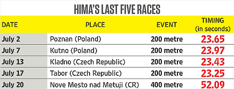 She is only too aware of the challenges ahead of the Olympics. In 400 metres, Hima is ranked 87th in the world; in 200m, she is 122nd; her overall ranking is 1250. Being a 400m specialist, Hima’s personal best timing is 50.79 seconds which, considering how even milliseconds matter in athletics, is in a different league from her gold-winning time in Prague on July 20—52.09 seconds. Also, her 200m personal best is 23.10 seconds, and the best of her 200m timings in Poland is .15 seconds slower.