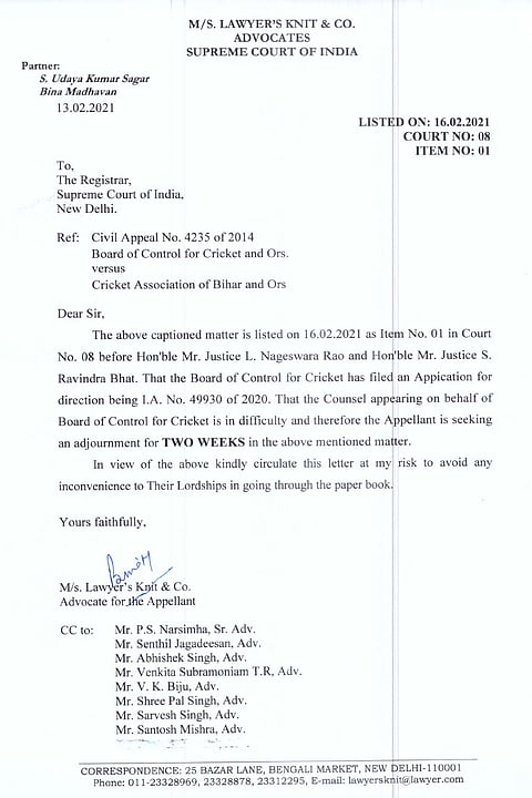 In what looks a delaying tactic, the legal team of the Board of Control for Cricket in India has sought a two-week adjournment in the Supreme Court hearing on the continuation of Sourav Ganguly and Jay Shah as president and secretary of the Board. (More Cricket News)