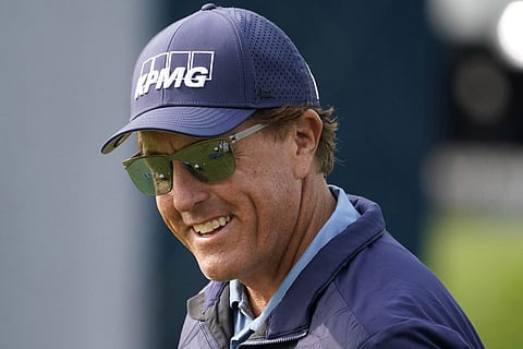 Phil Mickelson smiles as he heads to the range in Mamaroneck for a practice. Photo: AP Photo/Charles Krupa