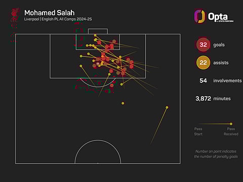 His 44 league goal involvements (27 goals, 17 assists) in 2024-25 is the joint-most by a single player in a 38-game season in the competition, along with Thierry Henry (2002-03) and Erling Haaland (2022-23).