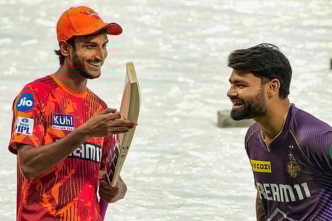 Kolkata Knight Riders' Rinku Singh with Sunrisers Hyderabad's Shahbaz Ahmed during a training session ahead of their 1st match of Indian Premier League (IPL) 2024, at Eden Gardens in Kolkata.