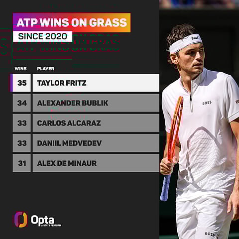 Fritz's victory may not have come in the manner he envisaged, but it was his 35th in ATP-Tour level matches on grass since the start of 2020. That is the most of any player on the tour, surpassing Alexander Bublik (34). Carlos Alcaraz and Daniil Medvedev have 33 each.