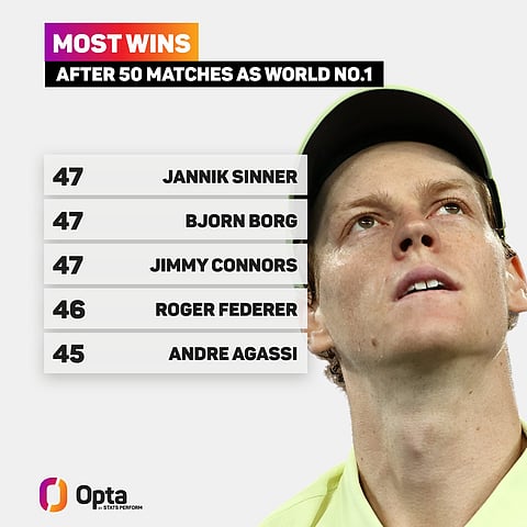 Sinner is also the first player to claim 10 consecutive straight sets wins over ATP top 10 opponents since the rankings were published in 1973.