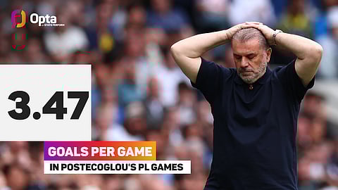 There were 3.47 goals per game in Postecoglou's Premier League matches in charge of Tottenham (264 in 76 games), the highest goals-per-game ratio of any manager to take charge of 50 or more games in the competition's history.
