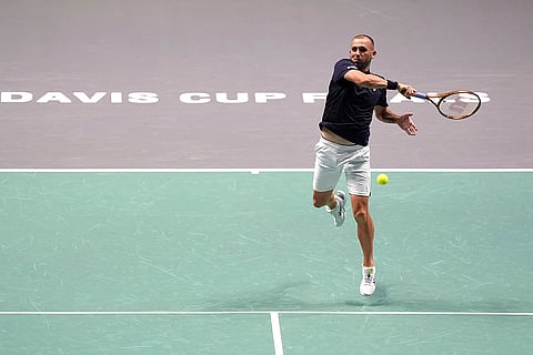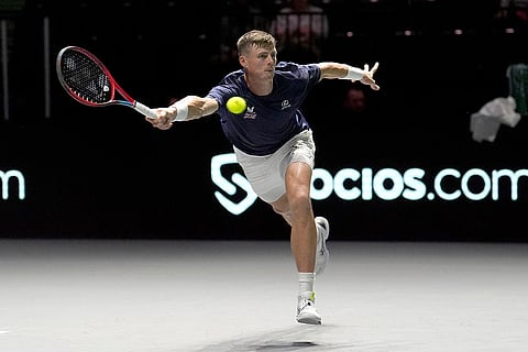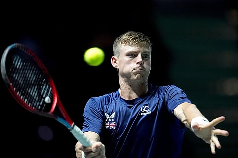 Britain's Daniel Evans returns the ball to Finland's Eero Vasa during the Davis Cup group stage finals match at the AO Arena, in Manchester, England.