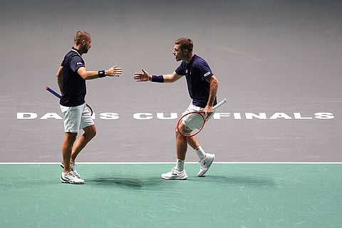 Great Britain's Dan Evans and Neal Skupski celebrate a point during the Davis Cup group stage finals match against Finland's Harri Heliovaara and Otto Virtanen at the AO Arena, in Manchester, England.