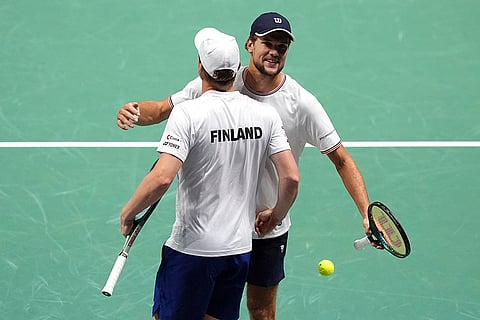 Finland's Otto Virtanen and Harri Heliovaara celebrate winning the Davis Cup group stage finals match against Britain's Dan Evans and Neal Skupski in Manchester, England.