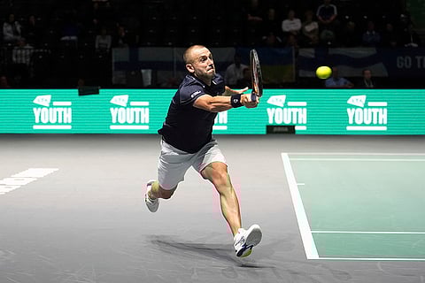Britain's Billy Harris returns the ball to Finland's Otto Virtanen during the Davis Cup group stage finals match at the AO Arena, in Manchester, England.