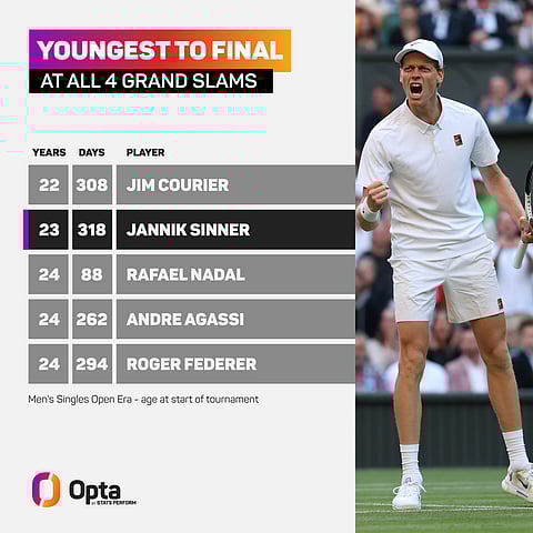 At the age of 23 years and 318 days, Sinner is the second-youngest man to reach finals at all four majors in the Open Era, older only than Jim Courier (22 years, 308 days), while he is the youngest to make four consecutive grand slam finals.