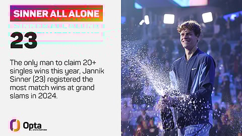 Sinner won 23 matches overall at grand slams this year, with no other player on the ATP Tour bringing up 20 (Alcaraz managed 19).