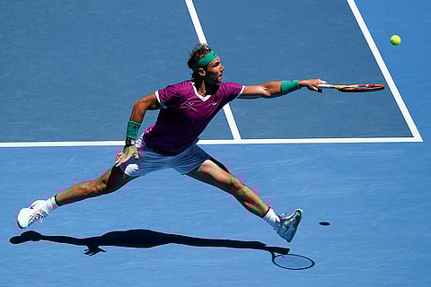 Rafael Nadal of Spain plays a backhand return to Yannick Hanfmann of Germany during their second round match at the Australian Open tennis championships in Melbourne, Australia, Wednesday, Jan. 19, 2022.