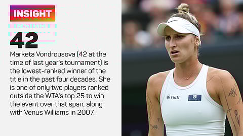 Vondrousova (42 at the time of last year's tournament) is the lowest-ranked winner of the title in the past four decades. She is one of only two players ranked outside the WTA's top 25 to win the event over that span, along with Venus Williams in 2007.