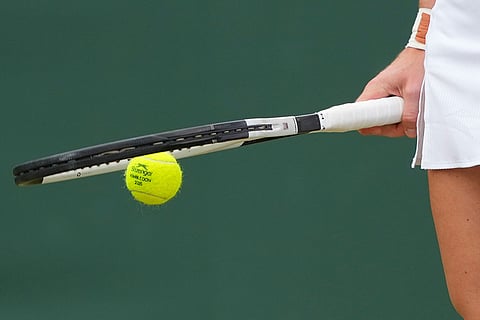 Elena Rybakina of Kazakhstan playing a returns to Clara Tauson of Denmark during their women's singles third round match at the Wimbledon Tennis Championships in London.