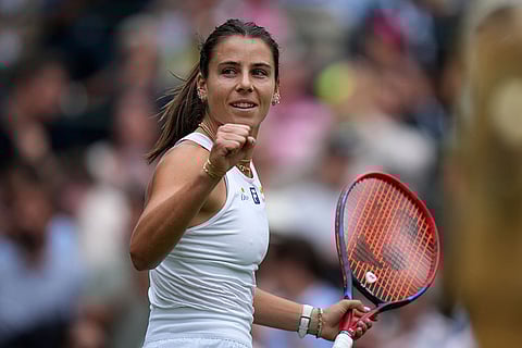 Emma Navarro of the U.S. celebrates winning the women's singles third round match against Barbora Krejcikova of Czech Republic at the Wimbledon Tennis Championships in London.