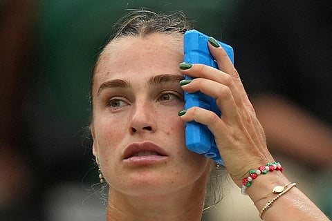 Aryna Sabalenka of Belarus uses an ice pack to keep cool during a change of ends break as she plays Belgium's Elise Mertens during a fourth round women's singles match at the Wimbledon Tennis Championships in London.