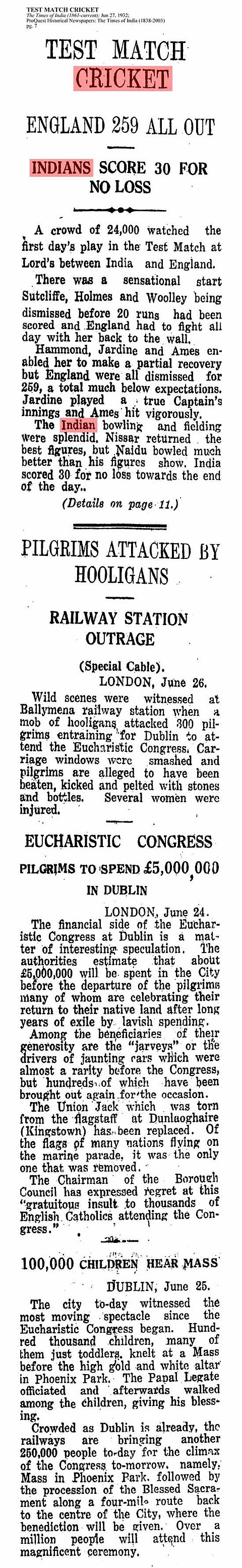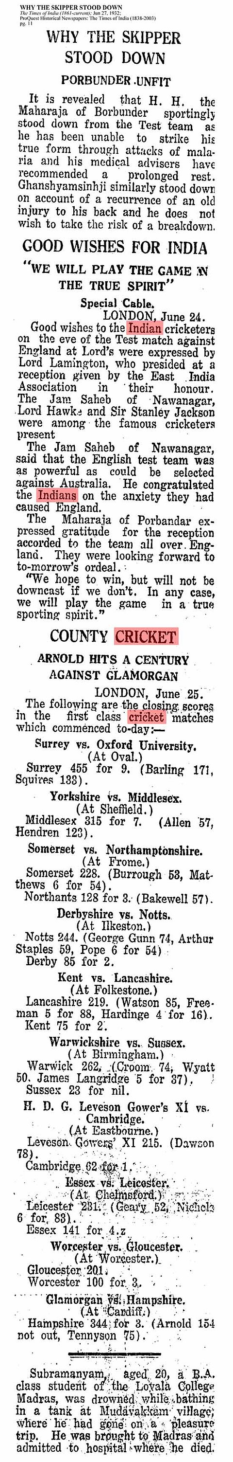 The Indians played their first tour match against T.G. Trott’s XI at Pelsham Farm, Pearmarsh near Rye on 29 April 1932. Interestingly, playing against the Indian team in this match was Duleepsinhji. While the Indians acquitted themselves fairly well, Lall Singh, the Sikh from Malaya, leading the way, it was on 22 May 1932 in the match against the MCC that the world had a glimpse of what India’s first home grown legend, C. K. Nayudu, was capable of. Nayudu, Wisden Cricketer of the year in 1933, smashed the first Indian century of the tour in style.