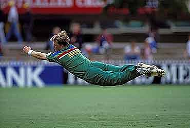 When he reached the top of his bowling mark, Allan Donald would turn around,narrow his eyes and throw a piercing glare at the batsman getting ready to facehim. He would then bend forward just a tad and start running, from side-on,resembling a horse in stride. As the canter turned into a gallop, his face,smeared with zinc cream for protection against the sun and dramatic effect,would contort, accentuating the cheekbones on his lean face. As he arrived atthe wicket, he would leap high, as if to surmount a hurdle in a dressage.Suspended in mid-air, time would pause, for a spell short enough not to breakthe delivery motion but long enough to remind the batsman, and us, of the showof hostility coming. Still with both feet off the ground, he would slip in asecond look to the batsman, and cock his wrist. The feet would land with a thudand the arm would hurl a hard, round ball like a guided missile.