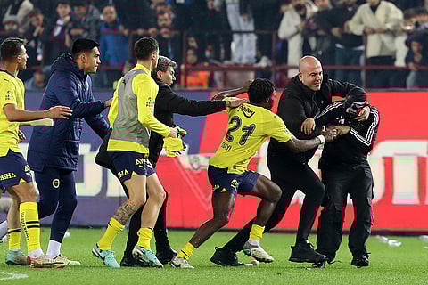 Fenerbahce's Michy Batshuayi, right, celebrates after scoring his side's third and winning goal during the Turkish Super Lig soccer match between Trabzonspor and Fenerbahce at the Senol Gunes stadium in Trabzon. Turkish top tier club Trabzonspor fans invaded the pitch following a home loss against Fenerbahce late Sunday, touching off violent scuffles between the fans and Fenerbahce players.