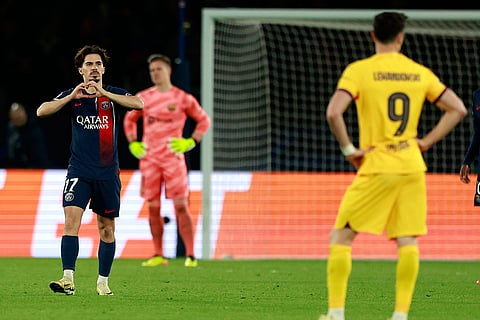 PSG's Kylian Mbappe, right, gestures as Barcelona players after their teammate Andreas Christensen scored his side's third goal during the Champions League quarterfinal first leg soccer match between Paris Saint-Germain and Barcelona at the Parc des Princes stadium in Paris.