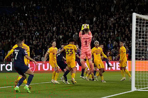 Barcelona's goalkeeper Marc-Andre ter Stegen, top, catches the ball during the Champions League quarterfinal first leg soccer match between Paris Saint-Germain and Barcelona at the Parc des Princes stadium in Paris.