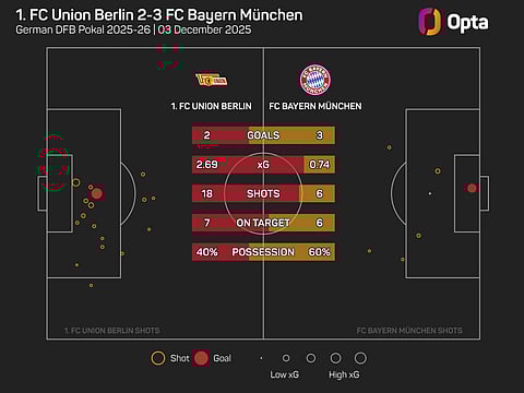 Union appeared to be back in the tie when Jonathan Tah handled from a long throw-in, allowing Querfeld to rifle in from the spot, but Bayern re-established their two-goal cushion on the stroke of half-time as Diogo Leite flicked into his own net.