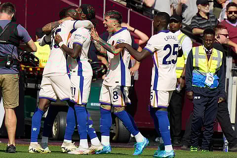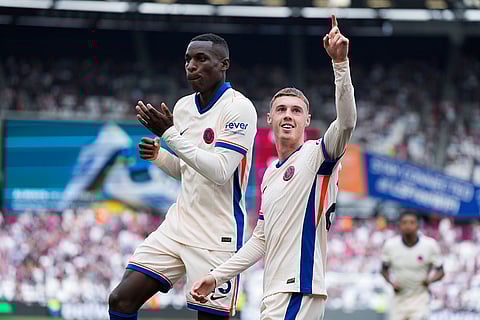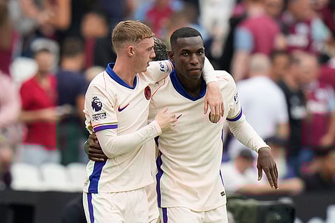 Chelsea's Cole Palmer, right, celebrates after he scored during the English Premier League soccer match between West Ham United and Chelsea at the London stadium in London.