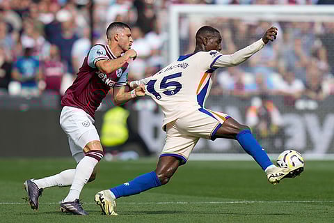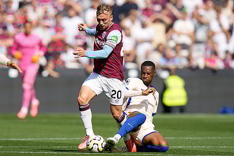 Chelsea's Tosin Adarabioyo tackles West Ham's Jarrod Bowen during the English Premier League soccer match between West Ham United and Chelsea at the London stadium in London.