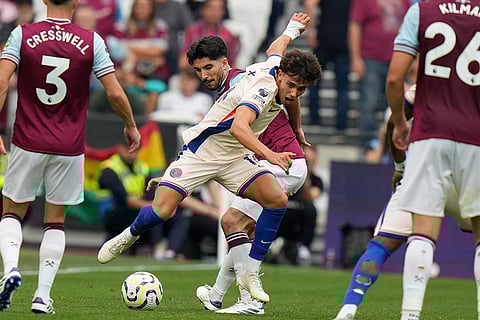 Chelsea's Joao Felix, front, and West Ham's Carlos Soler fight for the ball during the English Premier League soccer match between West Ham United and Chelsea at the London stadium in London.