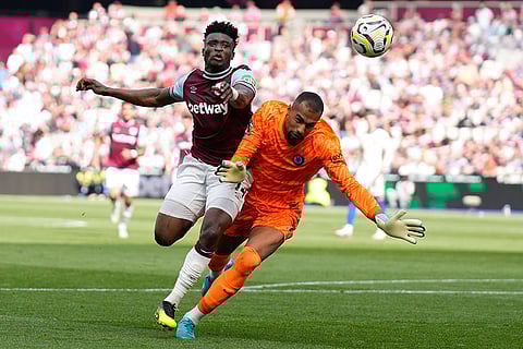 Chelsea's goalkeeper Robert Sanchez blocks West Ham's Mohammed Kudus during the English Premier League soccer match between West Ham United and Chelsea at the London stadium in London.