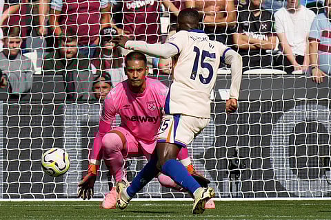 Chelsea's Nicolas Jackson scores during the English Premier League soccer match between West Ham United and Chelsea at the London stadium in London.