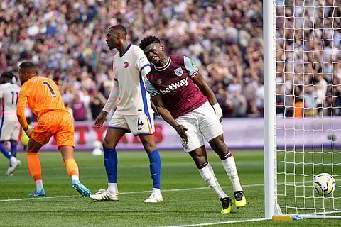 West Ham's Mohammed Kudus reacts during the English Premier League soccer match between West Ham United and Chelsea at the London stadium in London.