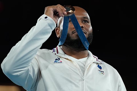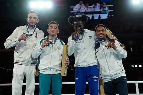 Silver medalist Spain's Ayoub Ghadfa, from left, gold medalist Uzbekistan's Bakhodir Jalolov and bronze medalists Germany's Nelvie Tiafack and France's Djamili-Dini Aboudou pose during a medals ceremony for the men's +92 kg final boxing match at the 2024 Summer Olympics in Paris, France.