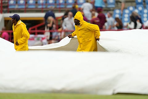 Grounds staff display the covers as rain delays the the fifth T20 cricket match between West Indies and England at Daren Sammy National Cricket Stadium in Gros Islet, St. Lucia