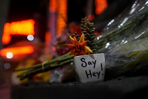 Flowers, candles and other items are placed at the statue of Hall of Fame baseball player Willie Mays outside of Oracle Park in San Francisco.
