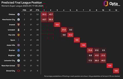 The Opta Supercomputer, though, has Chelsea in the driving seat on the final day with a 56.3 per cent chance of retaining their title.