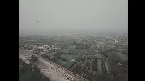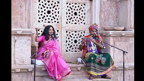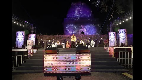 Other events on the festival itinerary also made for a fascinating blend of the new and the old. A hot air balloon ride on the morning of December 31, 2021, revealed more reasons, from the skies above, to keep visiting Mandu and its surroundings (for instance, the numerous dry forest trails criss-crossing the Vindhyachal range). A nighttime laser light-and-sound show, featuring the voice of actor Ashutosh Rana, in the Hindola Mahal on the historically significant premises of the Jahaz Mahal transformed the area with a rainbow of colours against the backdrop of a narration of Mandu’s history. Similarly, the music district—at Echo Point, close to Dai Ka Mahal, that once housed midwives—was enlivened on the evening of the 31st by a kavi sammelan that saw soulful performances, mostly centred around hasya kavita (comic poetry), from poets such as Sandeep Sharma, Parth Naveen, Lokesh Jadiya, among others. A short distance away, on the same evening, the Rewa Kund, a must-visit stop for those completing the Narmada Parikrama, saw a first-of-its kind Narmada aarti performed by priests to the accompaniment of chants and musical instruments both old (harmonium, dholaks) and new (electronic drum/octapad). An arts-and-crafts district showcased thought-provoking, mixed-media compositions (paintings and installations included) by local, contemporary artists, while a market nearby peddled traditional handicrafts such as bagh prints—handprinted, woodblock, relief prints native to Bagh in Madhya Pradesh’s Dhar district.