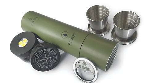 Made from military-grade aluminium, this adventure flask also doubles up as a 4-mode LED light and a precision compass. It is waterproof and the flask fits two collapsible shot glasses inside for a drink outdoors.