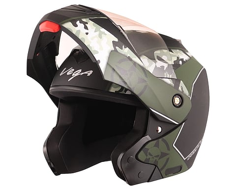 Gear up for off-road adventures with Vega's Crux Dx Camouflage helmet in Dull Black Battle Green. ISI certified, it combines a smooth matte finish with scratch-resistant, UV-protected optical polycarbonate visor. Weighing just 1100g, its metallic quick-release buckle, top vents, and removable, washable lining ensure a comfortable and protective ride.