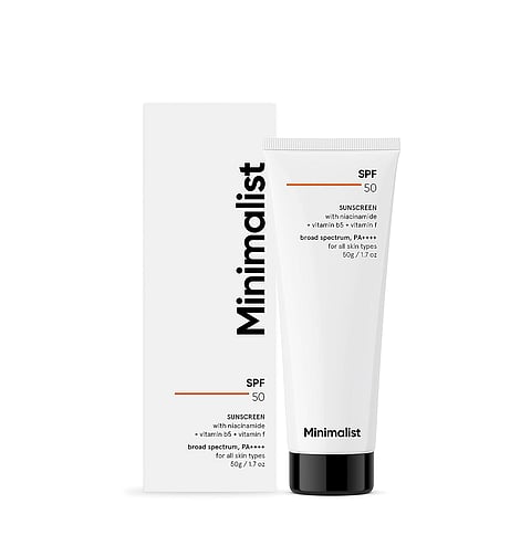 Minimalist Sunscreen SPF 50, a skin guardian for all, is fortified with potent UV-filters like Uvinul T 150, Avobenzone, Octocrylene, and Titanium Dioxide. Infused with vitamins A, B3, B5, E, and F, it not only shields from UVA & UVB but also nurtures and hydrates. Lab-tested for SPF 50, it's photostable, leaving no unwanted residue—just lightweight, nourishing protection.