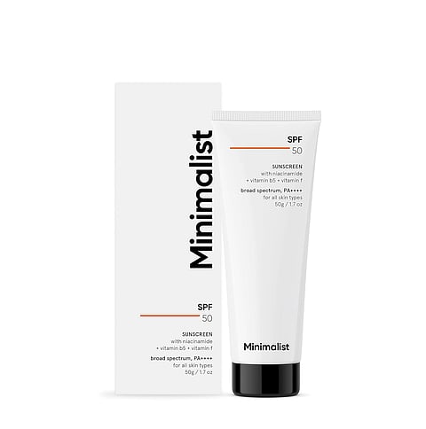 Minimalist Sunscreen SPF 50 is a skin-loving essential, featuring four potent UV filters for broad-spectrum protection against UVA and UVB. Enriched with Vitamin A, B3, B5, E, and F, it not only repairs post-sun exposure but also hydrates, soothes, and nourishes the skin of men's skin. The photostable formula, tested independently, ensures a confirmed SPF of 50 without leaving any white cast. This lightweight sunscreen spreads like a moisturiser, providing a non-greasy, residue-free feel. Trust the quality of filters sourced from BASF, Germany, and Royal DSM, Netherlands, making it a go-to for all skin types.