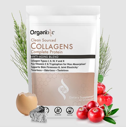Organixx’s Clean Sourced Collagens support skin firmness and joint elasticity. This supplement contains 5 types of collagen types and is infused with Vitamin C, B6, zinc & silica for increased bioavailability. It also includes tryptophan for 8g of complete protein per serving.