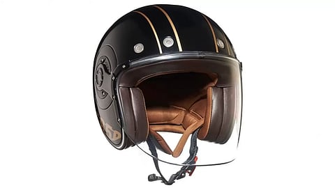 Royal Enfield Super Meteor 650 Spirit Gold Helmet is an open-face helmet designed with a high-impact grade thermoplastic shell. Highly comfortable and stylish, this helmet is ISI-certified, features a UV visor, and comes with a micrometric lock with a D-ring.