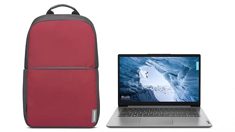 A lightweight and portable laptop with an Intel Celeron N4020 processor, 4GB of RAM, and 256GB of SSD storage, bundled with a 15.6-inch red executive backpack.