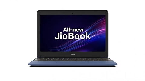 A thin and light laptop with an octa-core processor, 4GB of RAM, and 64GB of eMMC storage, running on JioOS 4G LTE.