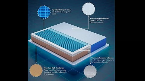 The XpertGRID by Wakefit features 3500+ airflow channels that use airflow to regulate the body's temperature. Its intelligently designed grid material also responds to pressure points on the body to provide a combination of medium firm & medium soft comfort for a restful night's sleep.