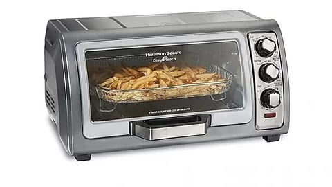 A multifunction OTG by Hamilton that you can use to air fry foods like fries, chicken wings and vegetables, making them crisp using little or no oil. It has a sliding-up front glass door and a capacity of 16-litre which is suitable for a small family. In addition to air frying, it offers modes of baking, broiling, toasting, baking and dehydrating, and is the best OTG in India with a 6-in-1 function.